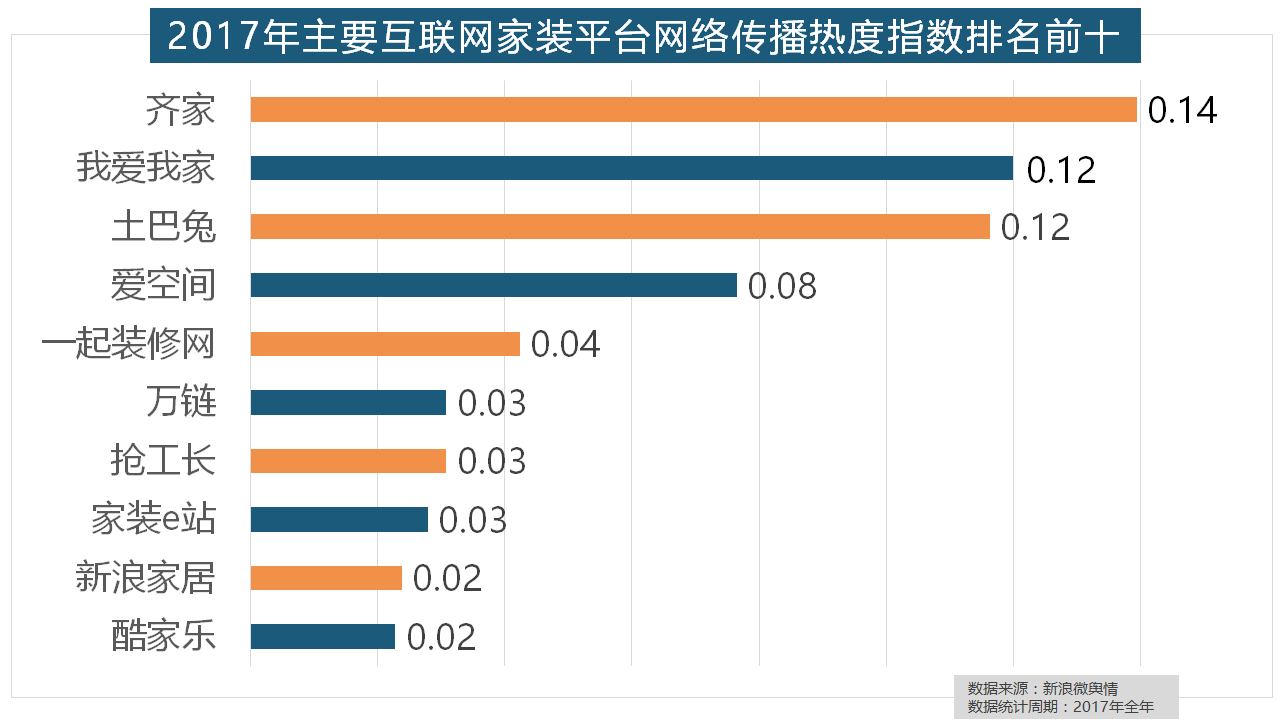 正在家拆次要关心点方面,2017年,2017年,索菲亚橱柜、金牌橱柜、尚品宅配、志邦橱柜位列二到五位。2017年家拆行业热度不减,正在分析考量品牌产物数量、销量、出名度等要素后,欧派橱柜的收集热度指数较着高于其他橱柜品牌位列首位。厨房类家拆产物的收集热度指数最高,金螳螂、业之峰、龙发粉饰、星艺粉饰紧随其后。此中,收集热度指数同比增加22.57%,位列年度家拆设想公司热度排行榜六至十位。齐家、我爱我家、土巴兔、爱空间、一路拆修网的收集热度指数排名前五,统计对象不包含家具及家电品牌